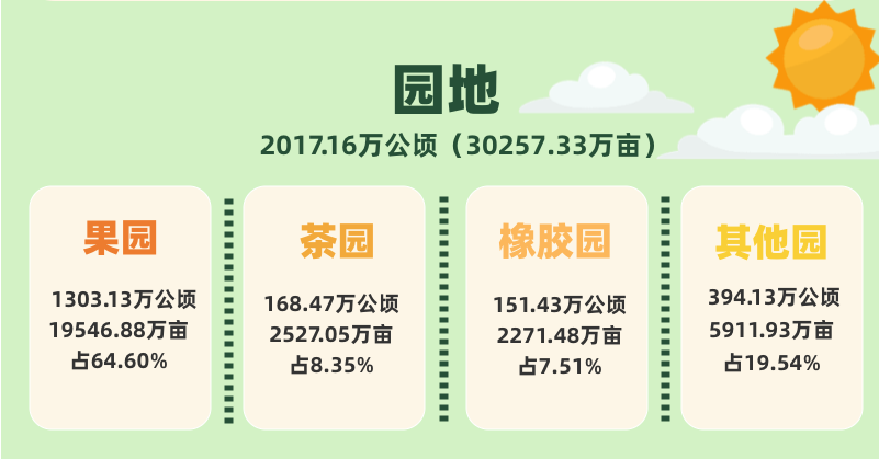 《公報》還顯示:我國園地面積3.03億畝。其中果園1.95億畝,占64.60%;茶園0.25億畝,占8.35%。草地39.68億畝。其中天然牧草地31.98億畝,占80.59%;人工牧草地0.09億畝,占0.22%。林地42.62億畝。濕地3.52億畝。城鎮村及工礦用地5.3億畝。其中村莊用地3.29億畝,占62.13%。交通運輸用地1.43億畝。其中農村道路0.71億畝,占49.88%。水域及水利設施用地5.44億畝。其中水庫水面0.51億畝,占9.28%;坑塘水面0.96億畝,占17.69%;溝渠0.53億畝,占9.69%。