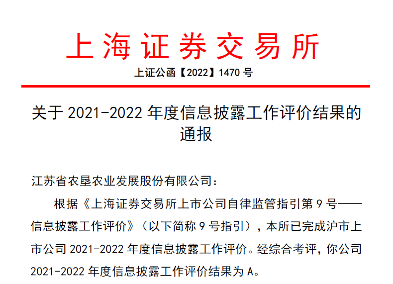 • 近日,上海證券交易所公布滬市主板上市公司2021-2022年度信息披露工作評價結果,蘇墾農發(股票代碼:601952)獲評最高等級“A”級,這是蘇墾農發連續第三年獲得信息披露工作最高等級評價。