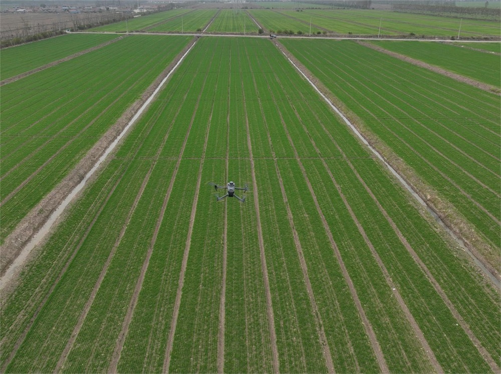 (2024年11月9日,蘇墾農(nóng)發(fā)東辛分公司無(wú)人機(jī)查看苗情)