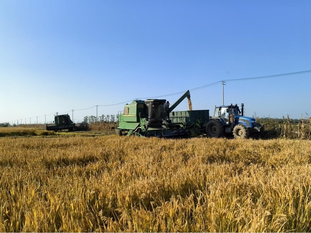 接連成片的稻田上,收割機(jī)馬力全開(kāi),運(yùn)糧車(chē)在田間有序穿梭,收割、脫粒、裝車(chē)一氣呵成。