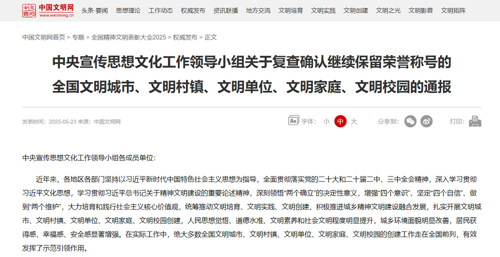 5月23日,中央宣傳思想文化工作領導小組公布《關于認定命名第七屆全國文明城市、文明村鎮、文明單位和第三屆全國文明家庭、文明校園的決定》和《關于復查確認繼續保留榮譽稱號的全國文明城市、文明村鎮、文明單位、文明家庭、文明校園的通報》。蘇墾農發順利通過復查評估,繼續保留“全國文明單位”稱號,這是繼2020年首創首成第六屆“全國文明單位”后又一次獲此殊榮。